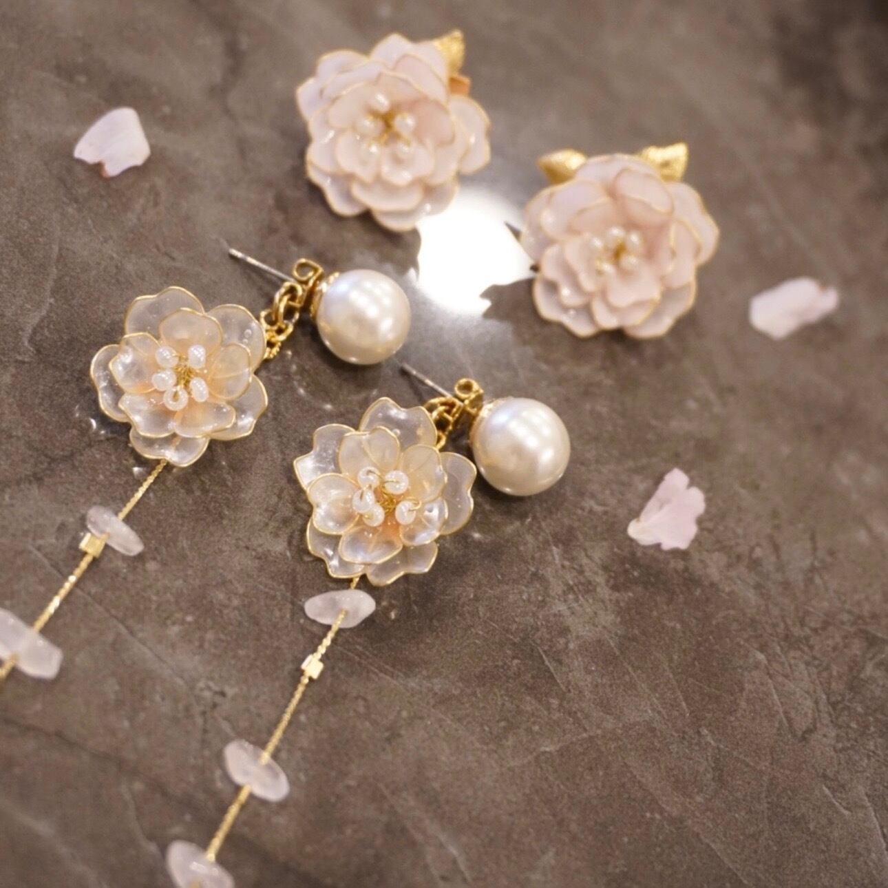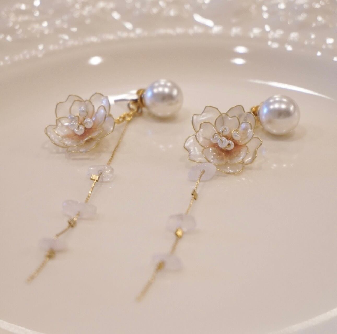 揺れるパーツは、ピアスのキャッチ部分に付属しているので、桜モチーフの部分をパールに変更したり、桜モチーフ単体で付けていただいたり、
