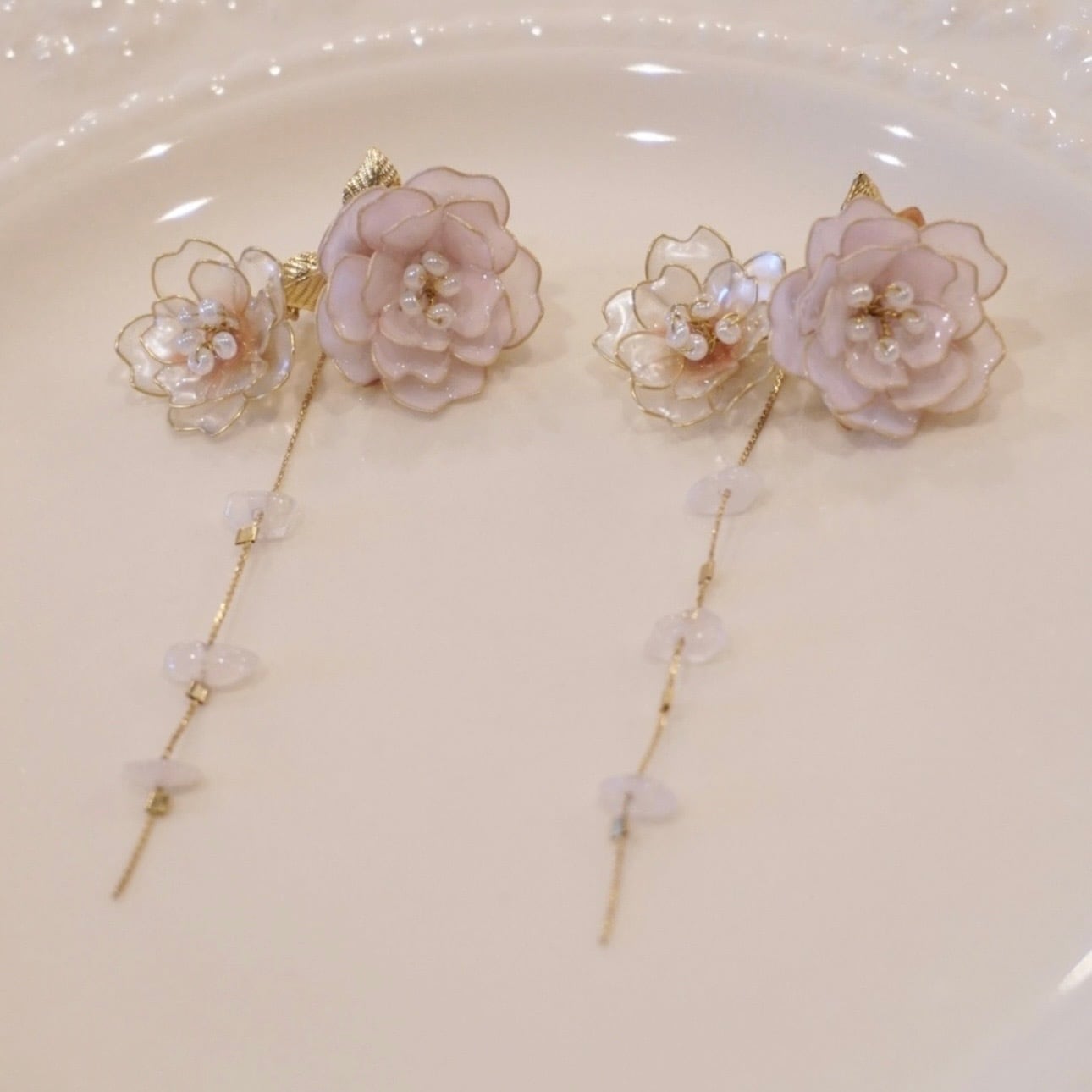そして揺れるローズクォーツの天然石が、花びらが散る儚さをも想像させる、華やかさと存在感に溢れているけど、どこか上品で大人っぽい…